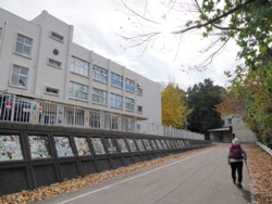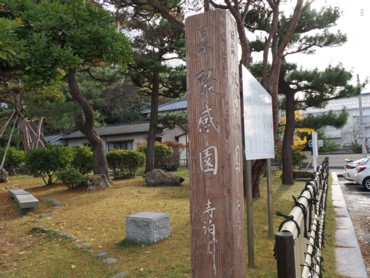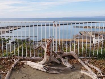 ここから車で寺めぐりコースで移動。あとでわかったが歩いてもすぐの所だった。聚感園の駐車場に駐めようとしたが満車。(10台位しか駐められない)ちょっとグルグルして照明寺に車を駐めた。(駐車場は数台)13時5分、ここから歩き出す。 色々な所に道がありちょっと迷路状態。とりあえず階段上がってみると未舗装の道で出た。ロマンス街道と書かれた看板があり、右へ行けば汐見台とあったのでそちらへ向かう。 5分程で汐見台に出た。寺泊中学校跡地という石碑があり校舎も残っていた。名前の通り、日本海を見下ろせて夕日がきれいな写真パネルもあった。広い駐車場とトイレもあった。 |
