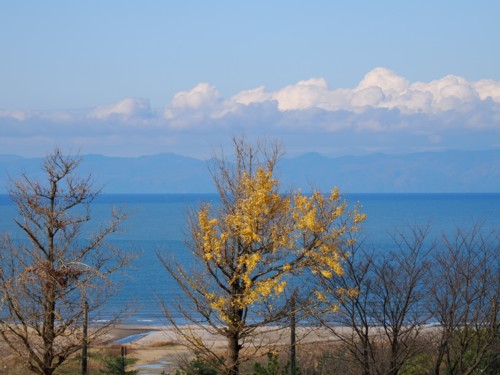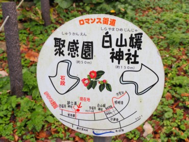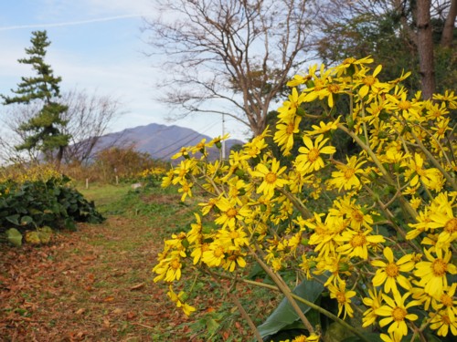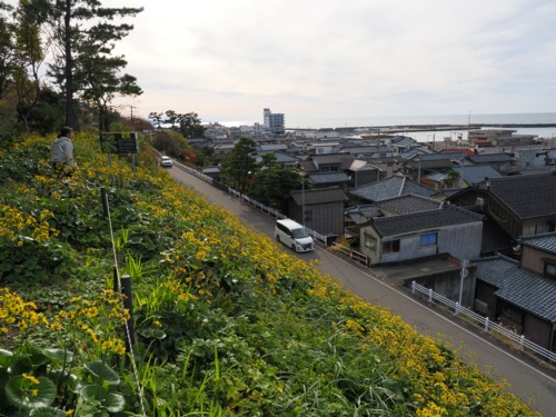 来た道を戻り20分程行くと法福寺。そこから下って車道に出て聚感園。また上がって白山姫神社。下ってツワブキ坂展望台。名前の通り、ここがツワブキの群生地。台地一面にツワブキが咲き、下の車道への法面が一面ツワブキの群生。日本海も見下ろせてやはりここが一番のロケーションだった。 |