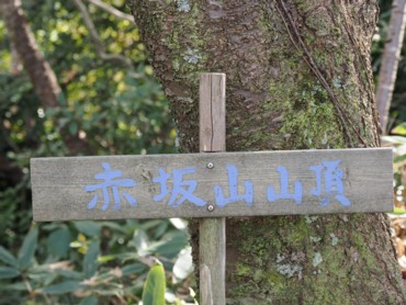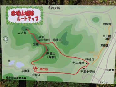 11時35分、赤坂山山頂着。展望もなく看板がなければ山頂とはわからないような所だ。山頂から少し下ると分岐。このコースは周遊出来るようになっていて、我々は時計回りに来ている。右が下山路、左が本丸・二ノ丸。 |