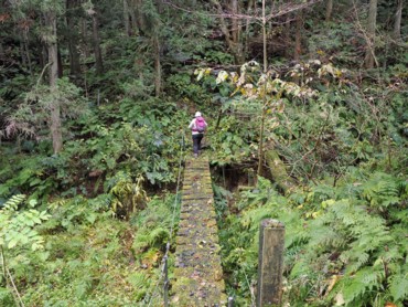 林道を10分程行くとやっと看板があり登山口とわかった。小さな橋を渡るといきなり急登。濡れて滑りやすく一気に登山モードになった。山は雑木林が多く紅葉するような木は少ない。 |