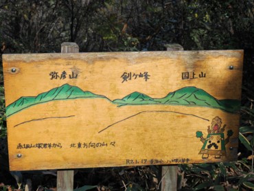 12時15分、下山。来た道を戻りすぐに本丸。登山道から少し上がると広場になっていた。展望もありここでお昼にすればよかったと思った。木々の間から越後三山も見え、また違う方向からは日本海も見下ろせた。 |