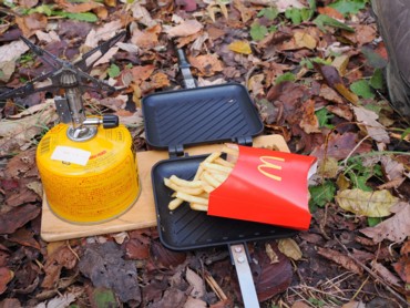 すぐに本丸。3分程で二ノ丸に着いた。看板はあったが文字は消えていた。ここで昼食。今日のお昼は朝マックならぬ山マック。登山口へ行く途中にあるマクドナルドでハンバーガーをテイクアウトして、ホットサンドメーカーで温めて食べることにした。先週の手作りパン屋に続いてのホットサンドメーカーの出番となった。 ホットサンドメーカーで焼くとバンズがカリカリになっていつものマックとは違う味になってしまうが、それはそれでおいしかった。ポテトは時間が経つとシナシナになってしまうが、これはホットサンドメーカーで焼くと出来たてのようになりこれはよかった。低山歩きは少し退屈な所があるので昼食を工夫して食べるのも楽しみにしている。 |