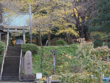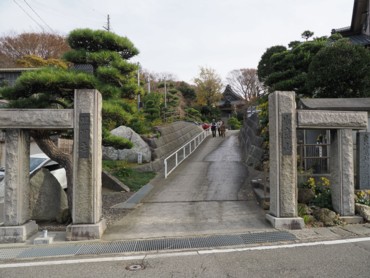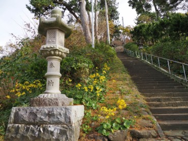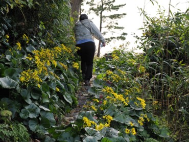 分岐から下山。こちらの下山路は道も広く緩やかで歩きやすい。多分こちらがいわゆる表参道のようだ。12分程下ったら車道に出た。十二神社の入口でそこから3分程で小学校の駐車場に戻った。小学校のすぐ下に養泉寺というお寺があって、その墓地周辺にツワブキが群生。日本海も見下ろせて抜群のロケーションである。 |