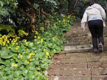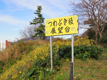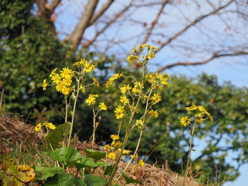 | 寺泊小学校へ登る車道の法面に咲くツワブキ | |