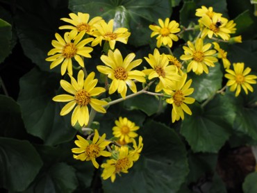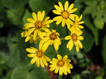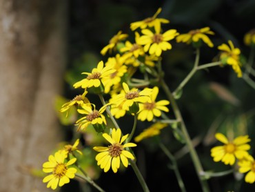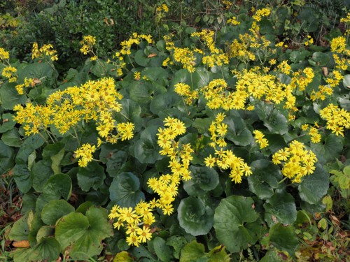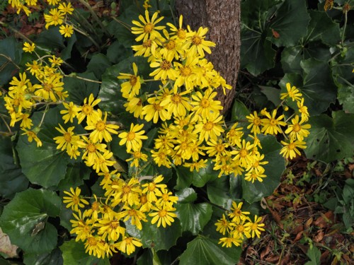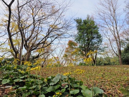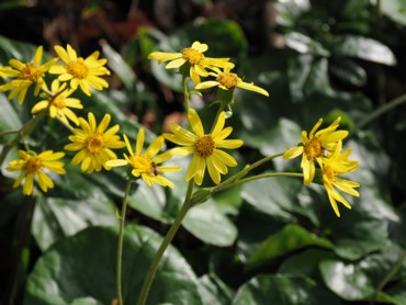 朝10時10分、自宅発。11時、寺泊小学校駐車場着。11時15分、歩き出す。ヤマップの地図を印刷して持ってきているので、それを見て進むが、いまいちよくわからない。看板もなくとりあえず小学校脇の舗装された林道を登る。 小学校脇にツワブキを発見。というか小学校へ来る途中の車道の法面にツワブキが群生して咲いていた。ツワブキ坂まで行かなくても見られるとは思わなかった。あとでわかるがもうこの周辺は民家の庭先から道路端までそこかしこにツワブキが咲いていたのである。 |