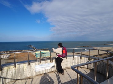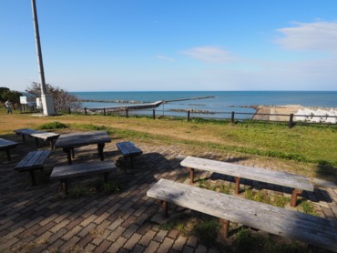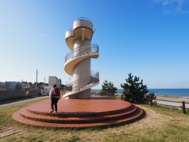 ここから日本海の方向へ進む。登り坂を進むと日本海が見える。そしてそれを見下ろすように展望台がある。日和山展望台着10時30分。無料の駐車場が結構多くあった。朝曇っていたがすっかり晴れて佐渡島もよく見えた。 |
