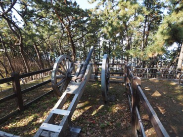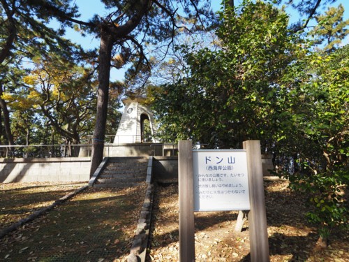 ここから日和山展望台まで戻り反対側の西海岸公園へ。途中、テーブルとベンチがあったのでここで昼食。時間は11時10分。街歩きをするので街中で昼食をとも思ったが、時間的にこの辺でお昼になりそう。でもこの辺で昼食を取れそうなお店もなさそうだったのでコンビニのパンを持参してお昼にした。 ここからしばらく行くと信号を渡り、すぐにドン山への分岐看板がある。階段を登るとドン山に出た。時間は11時35分。ドン山の由来は明治時代に正午の時報を告げるために「ドーン」と空砲を撃っていた「午砲台」から。復元された大砲も展示してある。 |