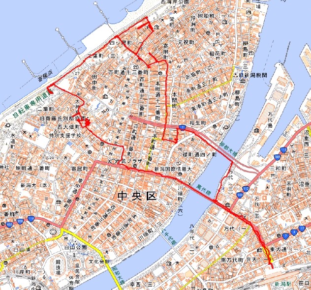 朝8時、自宅発。8時44分発、上越新幹線乗車。8時56分、新潟駅着。万代口を出て東大通を万代橋へ。橋の手前で信濃川に降りて柳都大橋へ。橋を渡って金刀比羅通りにある金刀比羅神社へ。北前船の模型が納められているようだが予約しないと見られない。 その後、旧小澤家住宅(北前船の時代館)の前を通ったが中には入らず、10時15分、日和山に到着。小高い丘の上に日和山住吉神社が祭ってある。眺めはいい。丘の法面にツワブキの花が咲いていた。終わっている花も多かったが、それでもきれいだった。標高12.3mと書かれた山頂看板があるので山であると認識した。 |