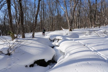 昨年3月に来た時はトレースがあったが今回はなし。それでその時の記憶とGPSを頼りに進む。森の中の平坦な地形で迷いやすい。所々小さな小川がいくつもあって夏道通りに進まないと橋を渡れない。それで雪原の中を適当に歩く訳には行かず気を使う。 |