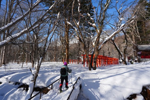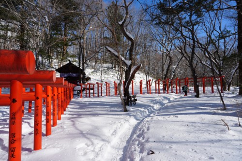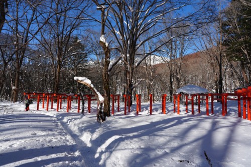 ここから鏡池へ。鏡池まではトレースがバッチリある。つぼ足でも大丈夫というか、その方が歩きやすいのだが、スノーシューを脱ぐのが面倒なのでそのままスノーシューで歩いた。また森の中に入るので展望はなくなる。 9時55分、天命稲荷。赤い鳥居のトンネルが続き、白い雪とのコントラストが鮮やかだ。 |