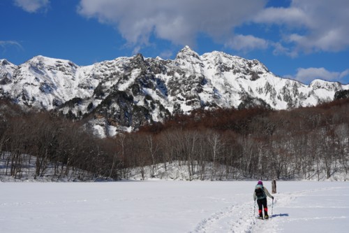 10時5分、鏡池。夏道を外れいきなり池の上に出た。積雪期の鏡池は2回目。今年は雪が少なく池の上を歩くことは出来たが、水が澄み出ていて陥没しそうで怖かった。それでも池の上を歩くという積雪期ならではの光景は何とも言えない。快晴の空、まさに絶景である。 ここで昼食。ここにも数人の外国人がいた。ここまで歩いてくるとはすごいね。あとでヤマップを見たら中社から小鳥ヶ池を越えて来る人も結構いるようだ。今度はそのコースで再訪したいと思った。 |