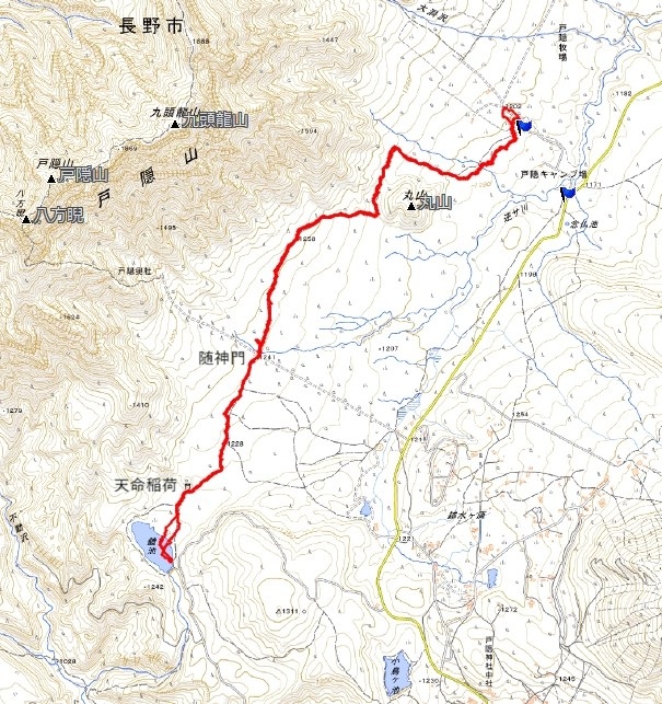 朝4時40分、自宅発。北陸自動車道上越ICを降りて国道18号から戸隠高原へ。7時、戸隠キャンプ場着。駐車車両なし。(下山時もなし)7時30分、歩き出す。しばらくはキャンプ場の中の車道を進み、適当にキャンプ場の中へ。前方の戸隠山の岩峰に朝日が当たりモルゲンロートになった。 |