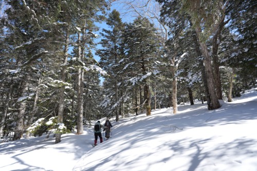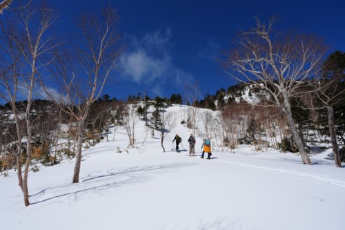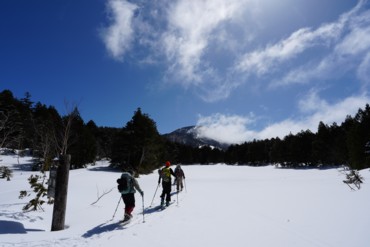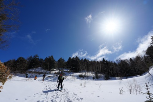 志賀山分岐まではずっと森の中。25分程行くと志賀山分岐。四十八池方面は夏道なら直進。もちろん夏道通り進んでも大丈夫。我々もずっと夏道を進んでいたが、昨年志賀山への登山道から夏は道のない雪原を歩けることを知った。 この方が近道になる上、夏道ならずっと森の中なのにこちらは開けた雪原で全然景色が違う。夏は歩けない池の上も歩ける。それでもちろん志賀山方面で。トレースもそちらにあった。 |