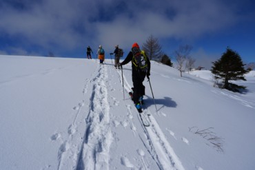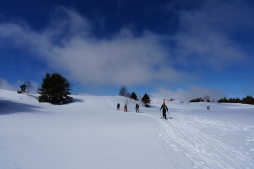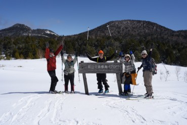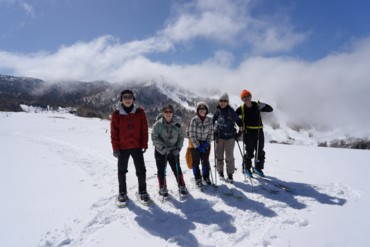| 昨年に続き大学時代の同期とスノーシュー歩きをした。F夫妻が山スキーを新調して山スキーで参戦。しばらくぶりに付けるシールに手こずっていた。当初は斑尾高原に登る予定だったが、山スキーが出来る所や天候の関係で志賀高原に変更した。 天気予報は曇りだったが朝から快晴。お昼を食べ終わる頃からガスになった。前日に降ったのか雪はパウダースノーだった。気温はマイナス4℃位でそれほど寒くはなかった。 |