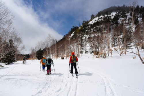 13時20分、四十八池。あとは下るのみ。遅い時間でもぽつぽつ登って来る人がいた。13時55分、渋池。森の中ではほとんど山スキーは滑らず恩恵なし。前山からの下りで最後少しだけ滑りを楽しめたようだ。 |