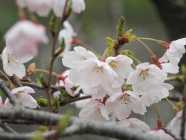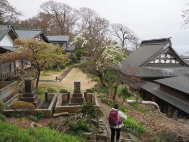 寺の建物の裏庭を登るも行き止まり、他の寺をウロウロすると舗装道路があり、それが近道のようだったので登る。そこから車道を歩く。法面にはキクザキイチゲやエンゴサク・スミレ・ツバキなどが咲いていた。 |
