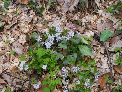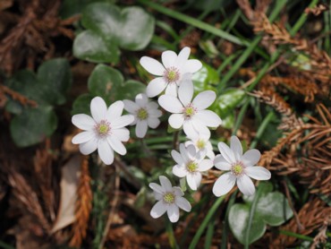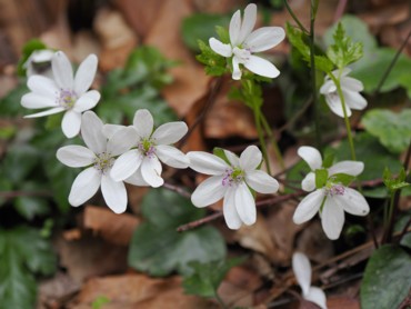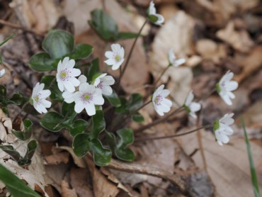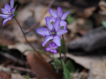 11時45分、下山。反対側へ下る。こちらの尾根は杉林ではなく広葉樹。道も広く歩きやすい。そして雪割草がずっと咲いていた。他にカタクリも。看板もあり階段やロープも張ってあって整備されていた。雪割草は角田山のように群生はしていなかったが、大きな株もあり、思ったより多く咲いていた。 |