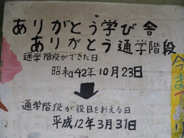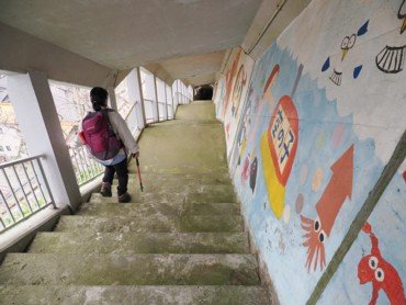 12時5分、車道に出た。車道をしばらく行くと出雲崎小学校校舎があった。古道からも見下ろせて、看板にも出雲崎小学校と書かれてあったが、ここは平成12年に西越小学校と統合して出雲崎駅近くに新築移転したとのこと。、旧校舎は就労支援施設として利用されているほか、体育館は少林寺拳法の道場として活用されているらしい。 さらに行くと休憩所心月輪があり隣に良寛記念館もあった。ここは以前来たことがあるので入らずスルー。トンネルの階段を下って下の車道に出た。この階段は出雲崎小学校の通学用に昭和42年に作られたとのこと。平成12年にその役目を終えたと書かれてあった。壁には小学生が書いた絵が下までずっと続いていた。ちょっと寂しい気持ちになった。 あとは車道を歩いて道の駅に戻った。時間は12時30分。売店でソフトクリームを頂く。ここはコーヒー味が人気らしい。 |