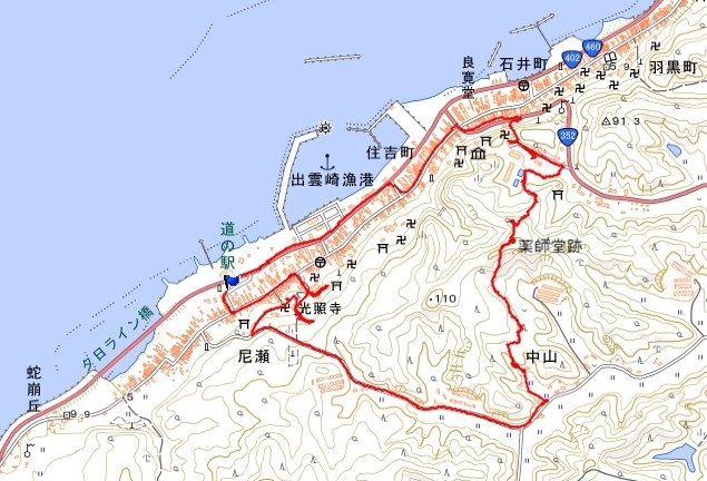 朝9時5分、自宅発。国道116号402号で道の駅出雲崎天領の里へ。9時45分、着。売店でサザエとタコのおにぎりを購入。10時5分、歩き出す。 国道を横断して北国街道へ。ここはお寺がいくつも隣り合って建てられてある。GPSを見ると、その内のひとつ、光照寺から中山へ向かう車道に近道で抜けられそうだったので行ってみる。光照寺は良寛が剃髪をした寺と書かれてあった。 |