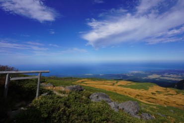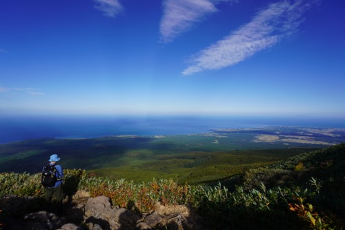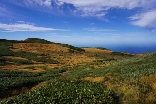 朝3時35分、自宅発。日本海東北自動車道遊佐菅里ICを降りて国道7号から鳥海ブルーラインへ。6時55分、大平登山口駐車場着。駐車車両は10台位。(下山時は20台位)7時20分、歩き出す。コンクリートの階段を登って見晴台までは九十九折りの登りが続く。 8時、見晴台着。名前の通り見晴らしがよく日本海が見渡せる。鳥海山の魅力の一つがこの日本海の近さだ。真っ青な海がきれいだ。 |