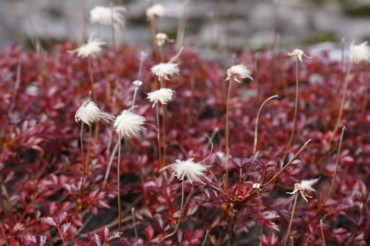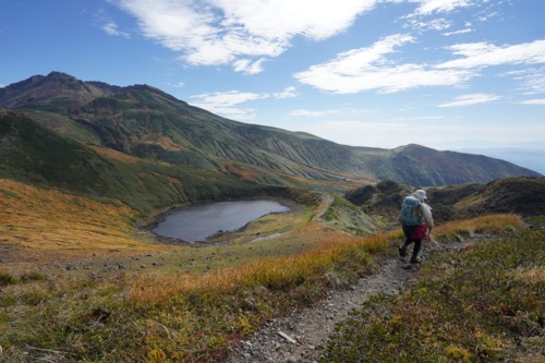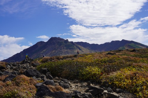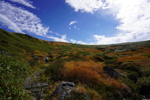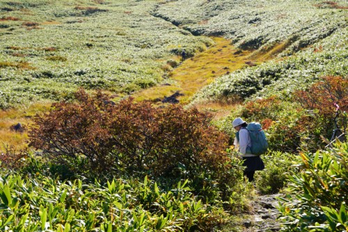 ここからしばらくは笹の中の登山道。時折、ナナカマドやカエデの木があって紅葉していたが、近くで見ると枯れている。この夏の猛暑が影響しているらしい。足元にはチングルマの草紅葉と白い穂が多く見られた。 |