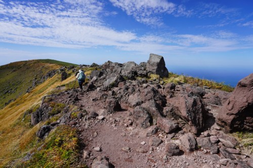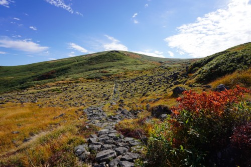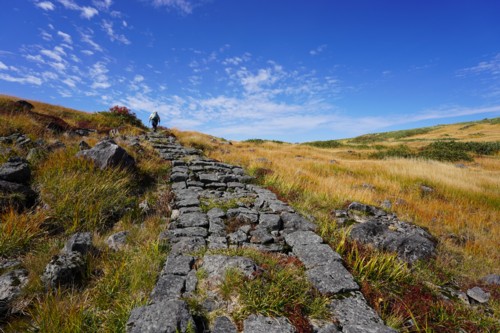 9時5分、河原宿。登山道は石畳になり前方の稜線まで続く広く雄大な斜面が草紅葉と相まって絶景だ。すぐに分岐。右へ行けば鳥海湖・笙ヶ岳、左へ行けば御浜小屋。前回は右へ行ったので今回は左へ。石畳の道は続くが傾斜がきつくなる。 |