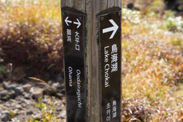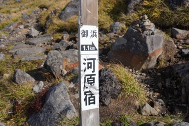 10時35分、分岐。ここから鳥海湖へ降りる道がある。意外と多くの人が降りていった。御浜小屋には行かずに御田ヶ原も巻いて新山へ向かうことが出来る。一度鳥海湖まで降りて見たいと思いながら今回もパスした。 |