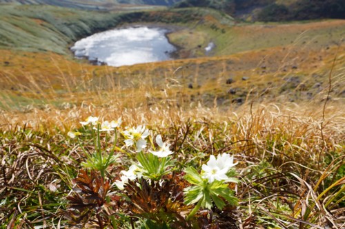| 咲き残ったハクサンイチゲと鳥海湖 | |