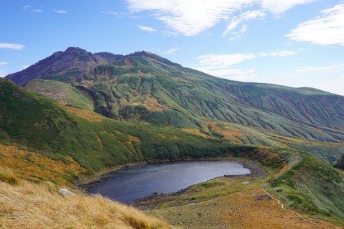 9時35分、御浜小屋。多くの人が休憩していた。ここまで数人の人しかすれ違わなかった。ほとんどの人が鉾立から登るので、大平から登ると人気の鳥海山でも静かな山歩きが出来る。トイレが使えるので拝借。 ここは鳥海山の山頂新山と鳥海湖が一つの視界に入る絶好のロケーション。そして鳥海湖の回りの草紅葉が加わって絶景感が増す。 ただ御浜小屋は鳥海山の第二外輪山のような地形でここの稜線に上がった途端、爆風に見舞われた。鳥海山は4回目だが爆風は初めて。東北の山で独立峰だから吹いてもおかしくないが、てんくらでも予報していなかったのでちょっと面食らった。 |