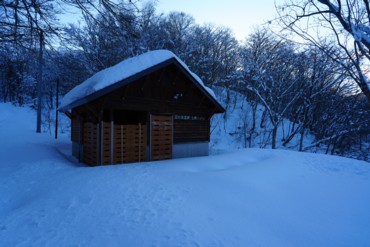 朝5時、自宅発。北陸自動車道上越ICを降りて国道18号で斑尾高原へ。7時25分、沼の原湿原手前除雪終点着。駐車車両はなし。(下山時もなし)7時50分、歩き出す。気温はマイナス7℃。沼の原湿原方面にトレースはあった。10分で沼の原湿原駐車場。トイレの建物がほぼ出ている。昨年は屋根の下まで雪で埋まっていたので雪の少なさがよくわかる。 |