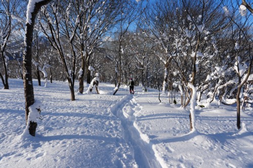 10時、湿原の入口付近で昼食にした。10時15分、下山。10分で沼の原湿原駐車場。10時40分、車に戻った。ここから希望湖に降りようかと少し下ってみたが、雪が少なく笹藪が埋まっていないので諦めた。 |
