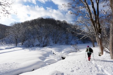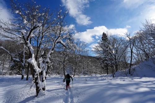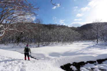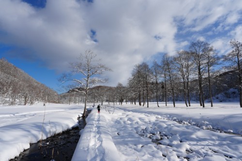 25分程で沼の原湿原入口。そこから湿原の中を進む。奥にある展望地まで行こうと思ったが、雪が少なく木道脇の小川が雪に埋まっていなくて、スノーシューだと歩きにくかったので途中で戻ることにした。 |